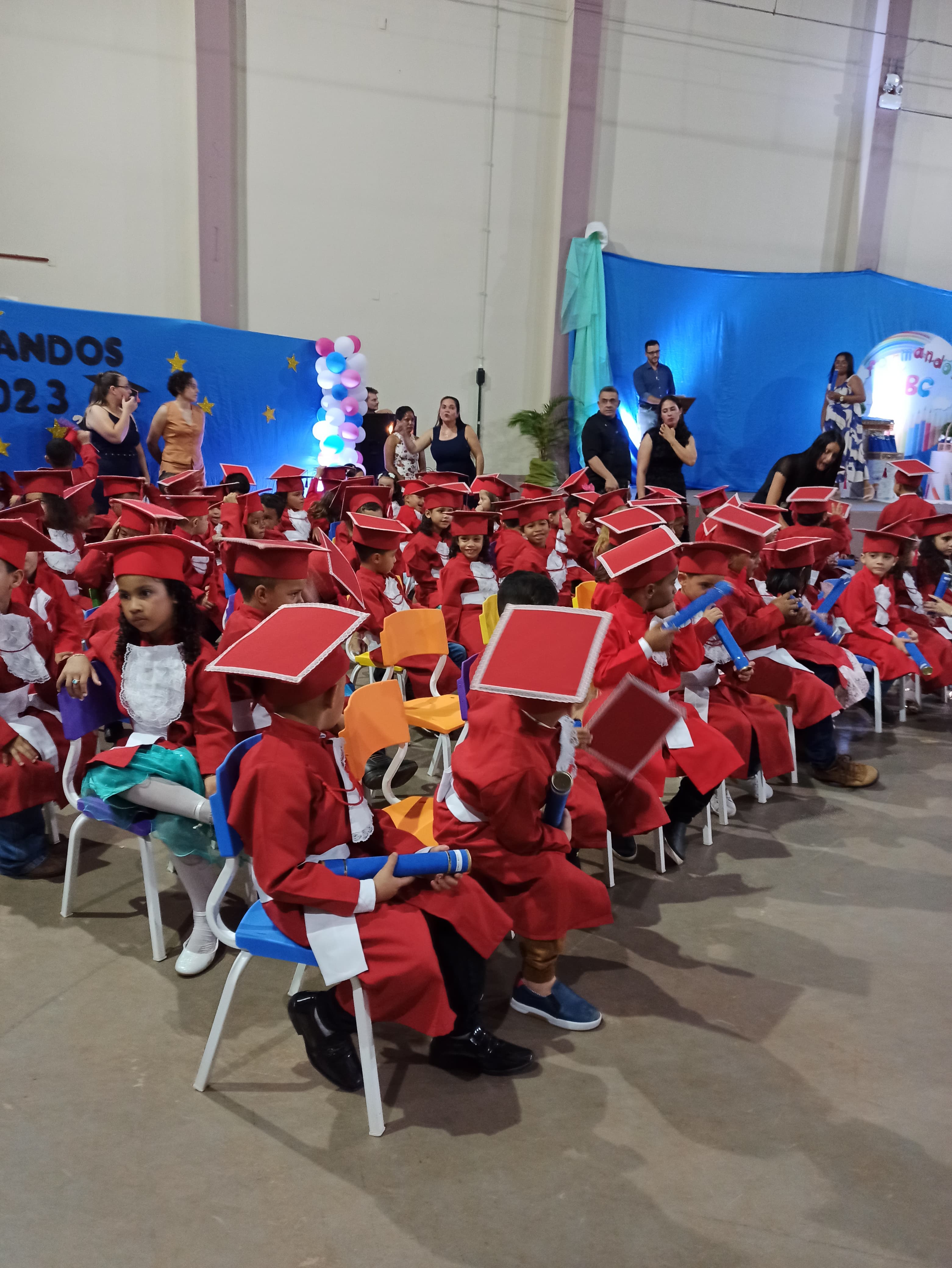 A festa de formatura foi realizada no salão da comunidade Santo Agostinho e contou com a presença dos familiares e amigos dos formandos. O ambiente estava repleto de alegria e emoção, com os pequenos vestidos a caráter e ansiosos para receberem seus diplomas.